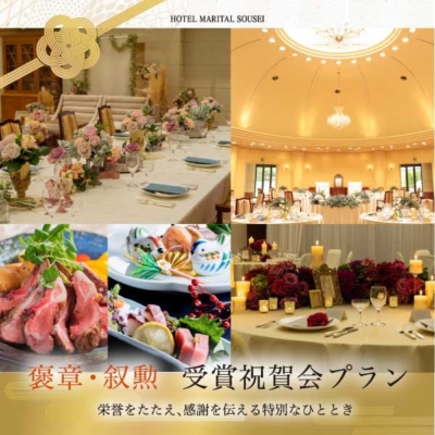 人生の節目となる大切な受章・受賞を、心に残る祝賀会で。ホテル マリターレ創世 久留米では、格式ある空間とおもてなしで、ご家族・ご親族、企業関係者とともに栄誉を称えるひとときをご用意いたします。 ご会食プラン内容 季節の食…