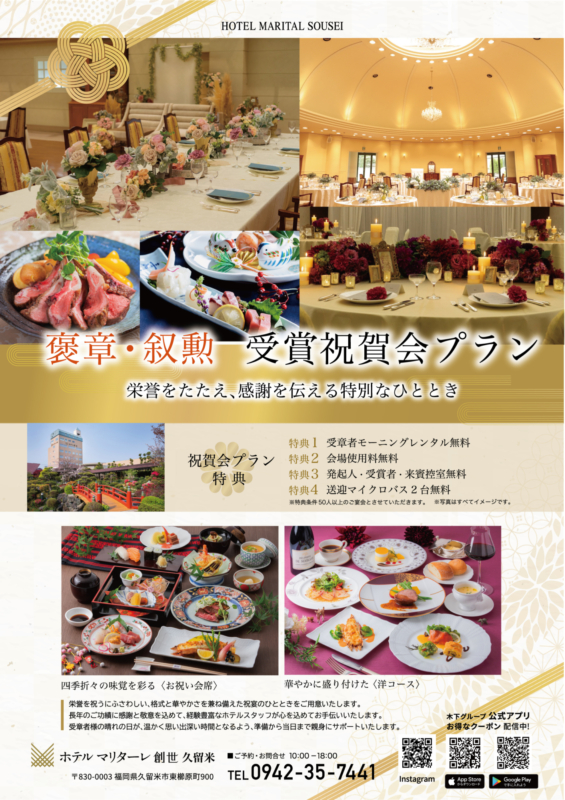 人生の節目となる大切な受章・受賞を、心に残る祝賀会で。 ホテル マリターレ創世 久留米では、格式ある空間とおもてなしで、 ご家族・ご親族、企業関係者とともに栄誉を称えるひとときをご用意いたします。