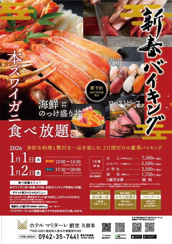2026年1月1日・2日の2日間限定。お正月を彩る、本ズワイガニ食べ放題、寿司、ローストビーフなどの多彩な料理と贅沢な逸品が並ぶ特別なバイキングです。ご家族、ご友人と新年の始まりを祝う特別な食卓を。お年玉抽選会もございます。