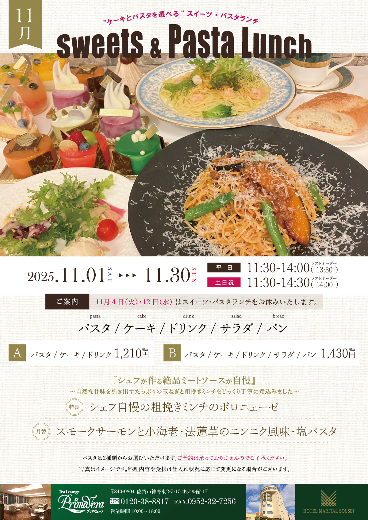 11月4日(火)・12日(水)はスイーツ・パスタランチをお休みいたします。