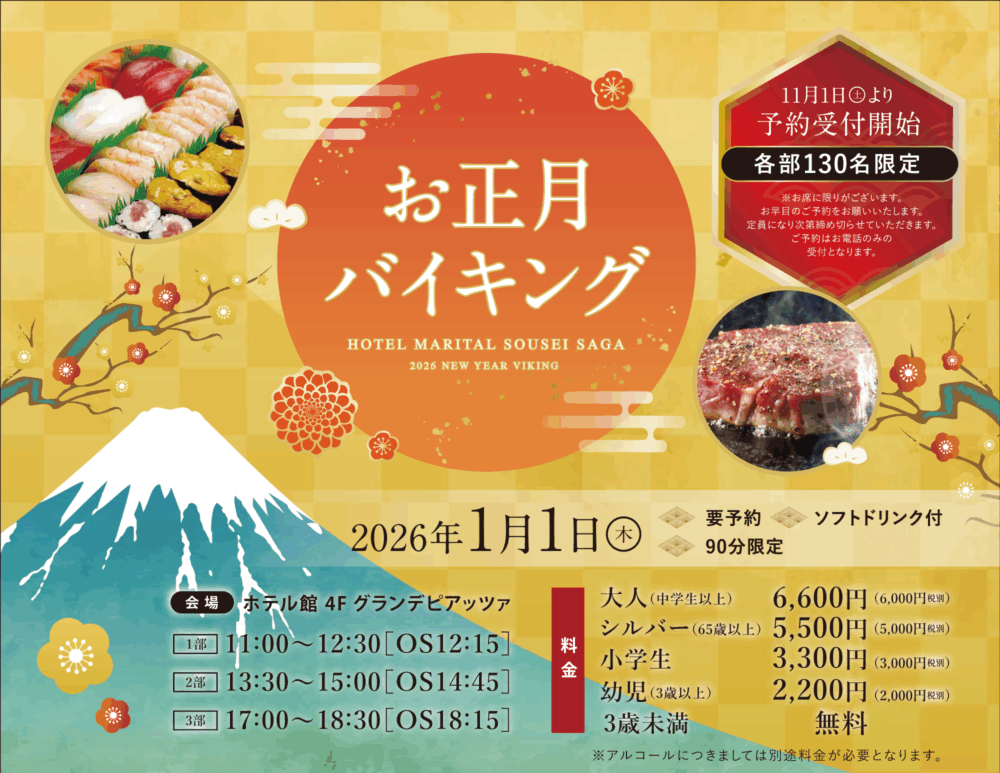 毎年ご好評の、お正月バイキングを2026年も開催いたします。