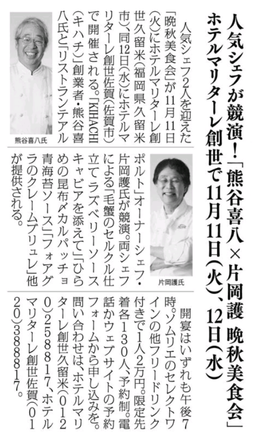 2025年10月11日(土)発行の西日本新聞にて「≪熊谷喜八シェフ × 片岡 護シェフ≫晩秋美食会」をご紹介いただきました。