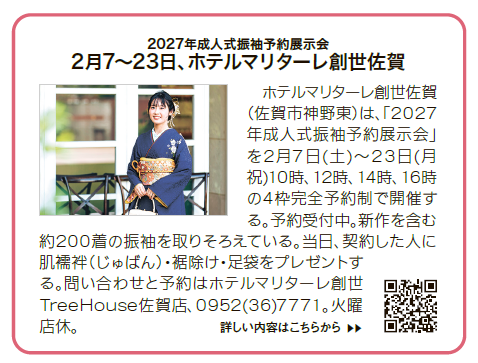 2025年1月28日(水)発行の佐賀新聞アドステーションにて「成人式振袖予約展示会」をご紹介いただきました。