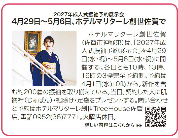 2026年3月25日(水)発行の佐賀新聞アドステーションにて「2027年成人式振袖予約展示会」をご紹介いただきました。